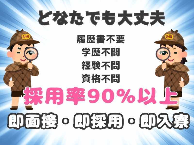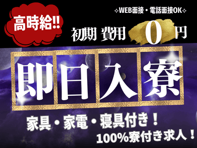 | 応募資格 | 【応募資格】 ・学歴不問! ・経験不問! ・未経験OK! →履歴書不要!WEB・電話面接OK! 「こんな悩みありませんか?」 ■所持金がほぼない ■家がない、すぐ出ないと…. ■携帯がブラックでヤバイ… →そのお悩み、すべて解決できます! 「こんなことができます!」 ★最短、今日から寮に入れます! ★宿泊支援、食事支援できます! ★携帯ブラックでも契約できます! →100%住み込み・寮付き求人がだから安心です!ぜひお任せください! |